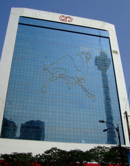 | 大きなビルのガラスにらくだが書いてあり、その前にKLタワーが移っていました。”KL空飛ぶらくだの絵!!”です。撮る位置によってKLタワーの写り方が変わるので、何枚か撮ったうちの一枚です。 |