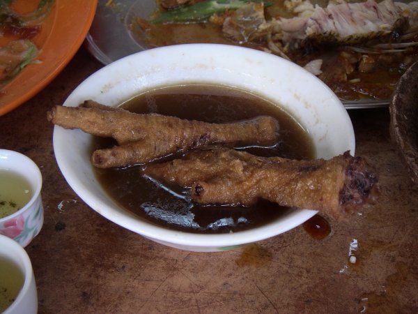 バクテーは小型の土鍋2つ出てきました。大人6人と子供一人の分量です。見た目、中身は豚肉のぶつ切りがごろごろ入っています。 それに、蒸したお魚(川魚)一匹、お魚の種類は分かりません。なまず系だそうです。写真の通りのものです。後で分かった事ですが華人の魚料理は焼くとか煮るはあまりなく丸ごと蒸して、色々なたれを掛け食べるのが一般的だそうです。このたれが、魚料理の違いだそうです。そして一番の高級魚はなまずだそうです。 それとレタス炒め、と薬味で煮た鶏の足です。鶏の足は下の写真のようにグロテスクです。薬味は青唐辛子とニンニクをみじん切りにしたものを中国醤油の中にたっぷりと入れます。取り皿にはご飯がのっています。 |