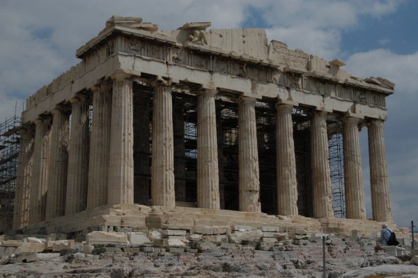ギリシャは2004年のオリンピックへ向け街中が工事中でした。取りあえず地下鉄で動き回り、アクロポリスのパルテノン神殿へ行きました。この山の上からはアテネ全体が見渡せます。しばらく景色に見とれていました。すばらしい眺めです。パルテノン宮殿もやっぱり修復工事中でした。 食事をして繁華街を徘徊していると、辻音楽士にであいました。珍しいのでくっついて歩きました。ピアノ線を叩く様な音をさせハンドルを回して音階を発生させます。一種の手回しオルゴールです。それに合わせておじいさんが歌います。奇妙な旋律ですが不思議な魅力がありました。 |
