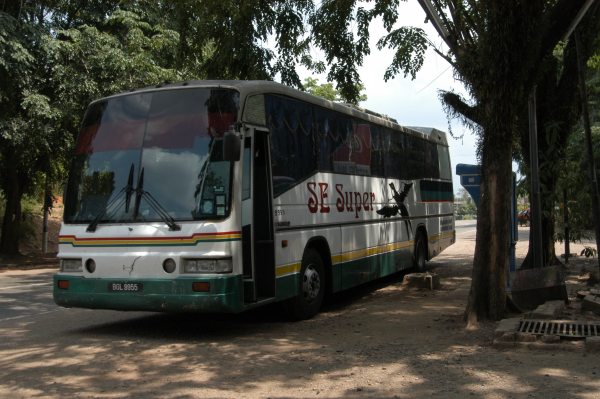 たまには何処かへ小旅行をしようと言うことになりました。 西海岸は、マラッカ、ポート・ディクソン、ポート・クラン、セキンチャン、ランカウイ島など行ってみましたが、ランカウイを除いてどの海も泥色をしていて、いまいちあか抜けません。 そこで今度は東海岸を見てみようという事になりました。東海岸は、西海岸に比べて、海の色が綺麗だ!という評判だからです。KLから真東のクアンタンに行くことにしました。地球の歩き方を見るとバスで3時間から5時間と言うことでした。 プドラヤバスステーションで切符を買ってバスに乗り込みました。R14(420円)でした。バスは、シンガポール行きと同じく横3席の日野製の豪華なバスでした。KLの中心部を抜けて、半島の背骨の様な山脈を超えて行きます。 |