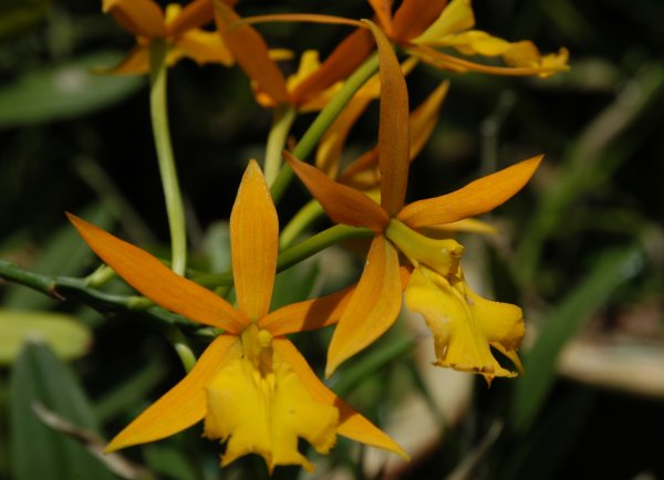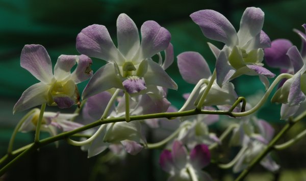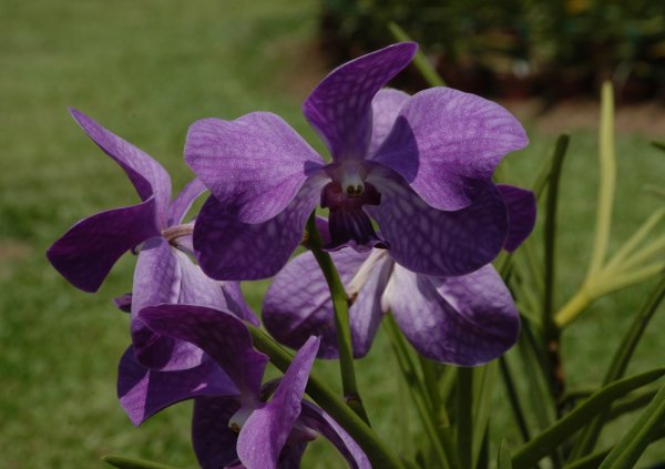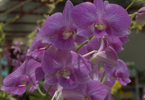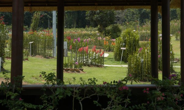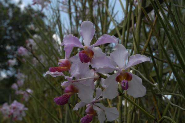 | 丘陵にそって蘭が植えて有ります。入り口も有るようなないような、おばさんが一人店番をしていました。5ドル払って入園しました。人影はほとんどなく、蘭園と言うよりは蘭畑といった方が当たっています。実際そういう場所を開放している感じです。ひとつの棟に同じ種類の蘭が沢山植えてありました。ボタニックガーデンのように、きれいにしつらえてあるのではなく、雑然と植わっています。くそ暑い、なだらかな傾斜の丘を登り降りするのも気合いがいります。蘭は直射日光にそのまま放り出されているので、私のデジカメではちょっと露出オーバー気味に撮れてしまいました。一通り見て回り、写真をたんねんに撮りましたのでくたくたになりました。入り口の自動販売機でコーラを買って椅子に腰を下ろし、一気飲みしました。 |