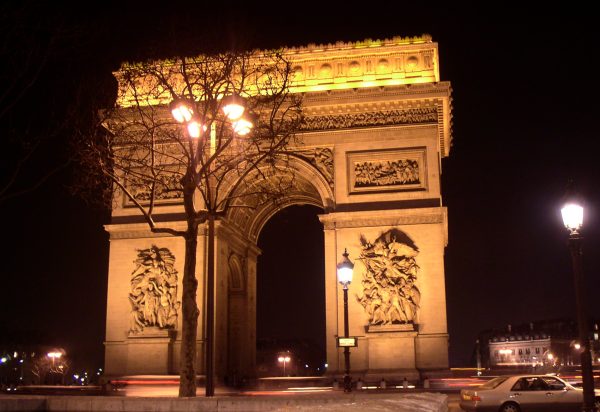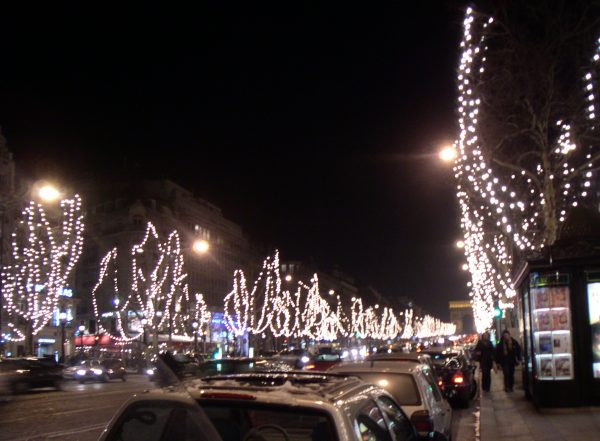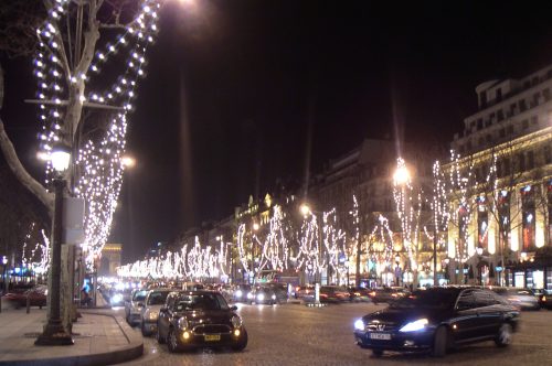| お正月6日夜のパリのシャンゼリゼ通り、前日雪が降ったせいでものすごい寒さでした。さすがにこの通りは雪が取り払われていましたが、夜の照明の美しさは世界一!ですね。 |