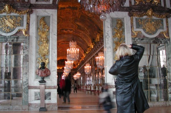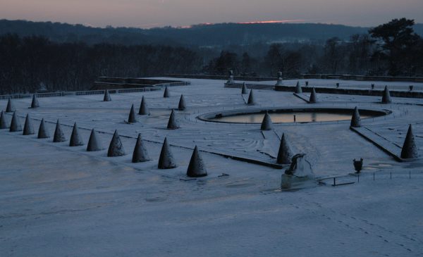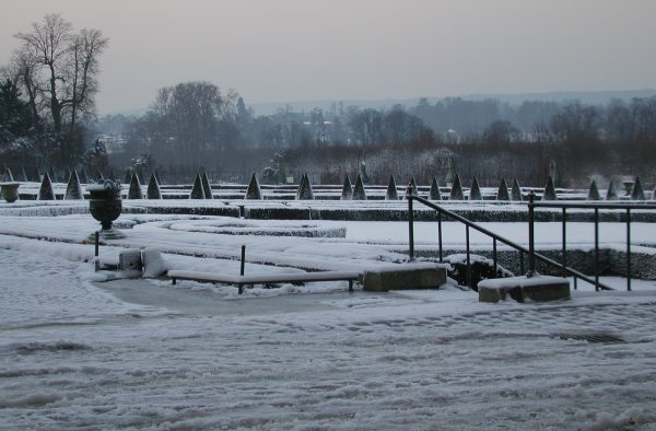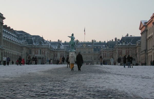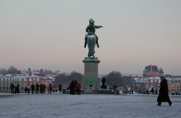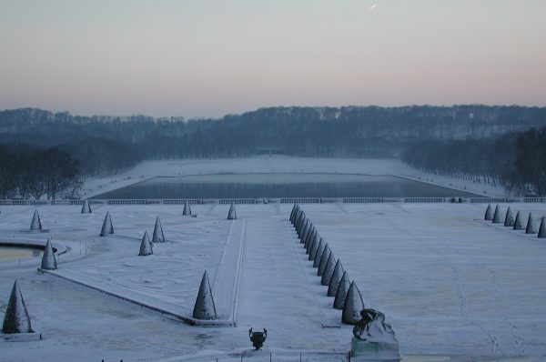 ベルサイユ駅を降りて外へ出ると、薄暗くなっていました。ベルサイユへの道順は案内標識がありすぐに分かりました。シャーベット状の雪道を20分ほど歩くと宮殿に着きました。中を見ようと受付へ行ったのですが、時間が過ぎて入れないとのことでした。 |