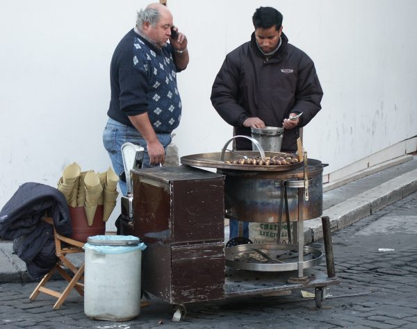 ローマのホテルは前回の時のホテルに近くでもっとスペイン広場よりでした。ホテルの入り口は写真の様に全くホテルとは思えません。ベルを押して戸を開けてもらいます。ホテルの内装はプチホテルにしては凝っていて重厚さを感じさせます。朝食も奥様製で美味しいものでした。 ローマにも焼き栗屋があります。焼き上がるのを待って一袋買いました。フランスにも焼き栗はありましたがイタリーで食べるものの方が美味しいと思います。 |