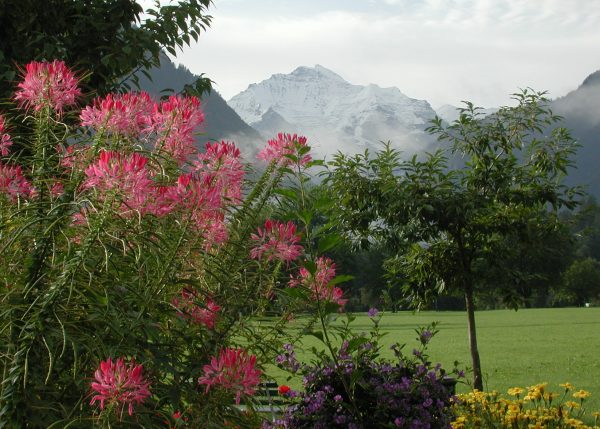 列車時刻表で調べてみたらバルセローナからインターラーケンまで約1000Kmありました。2日で1000Kmの旅をしたことになります。ここでゆっくり疲れを取る事にしました。ホテルは静かで清楚で品が良く眺めもすばらしいものでした。次の日は雨でしたがホテルでのんびりしても苦になりませんでした。雨があがって散歩をしました。空気が美味しくバルセローナの街と比べようがありませんが何処を歩いても美しく清潔です。 |